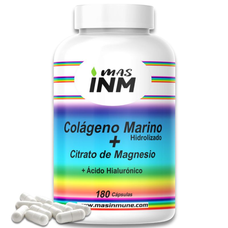 Este producto es un complemento alimenticio que combina colágeno hidrolizado marino, citrato de magnesio y ácido hialurónico, en cápsulas fáciles de tomar.