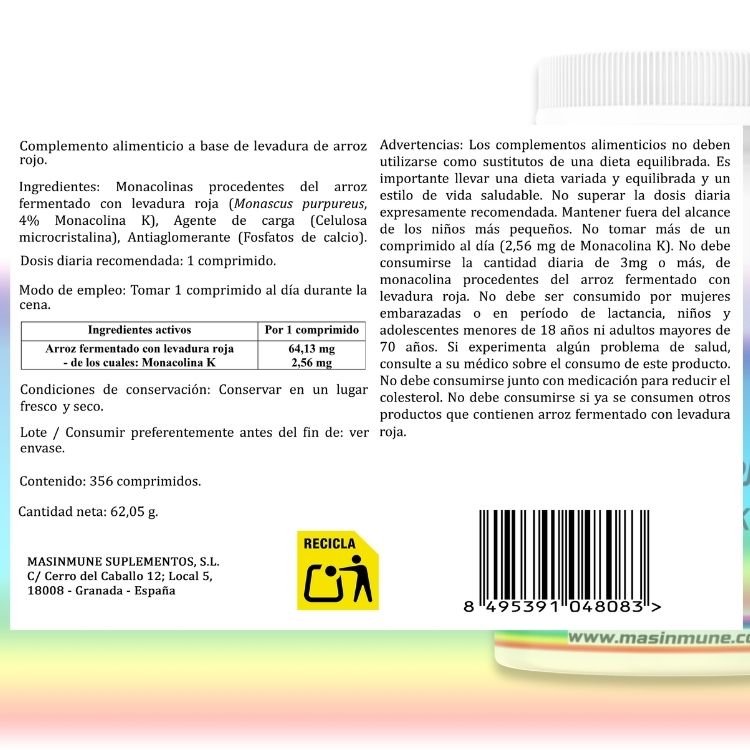 Advertencias: Los complementos alimenticios no deben utilizarse como sustitutos de una dieta equilibrada. Es importante llevar una dieta variada y equilibrada y un estilo de vida saludable. No superar la dosis diaria expresamente recomendada. Mantener fuera del alcance de los niños más pequeños. No tomar más de un comprimido al día (2,56 mg de Monacolina K). No debe consumirse la cantidad diaria de 3mg o más, de monacolina procedentes del arroz fermentado con levadura roja. No debe ser consumido por mujeres embarazadas o en período de lactancia, niños y adolescentes menores de 18 años ni adultos mayores de 70 años. Si experimenta algún problema de salud, consulte a su médico sobre el consumo de este producto. No debe consumirse junto con medicación para reducir el colesterol. No debe consumirse si ya se consumen otros productos que contienen arroz fermentado con levadura roja.