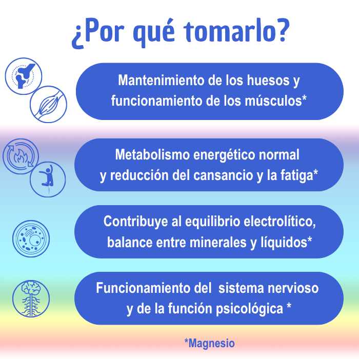 Masmagnesio es un complemento alimenticio que combina tres formas de magnesio: Citrato, Bisglicinato  y Malato.