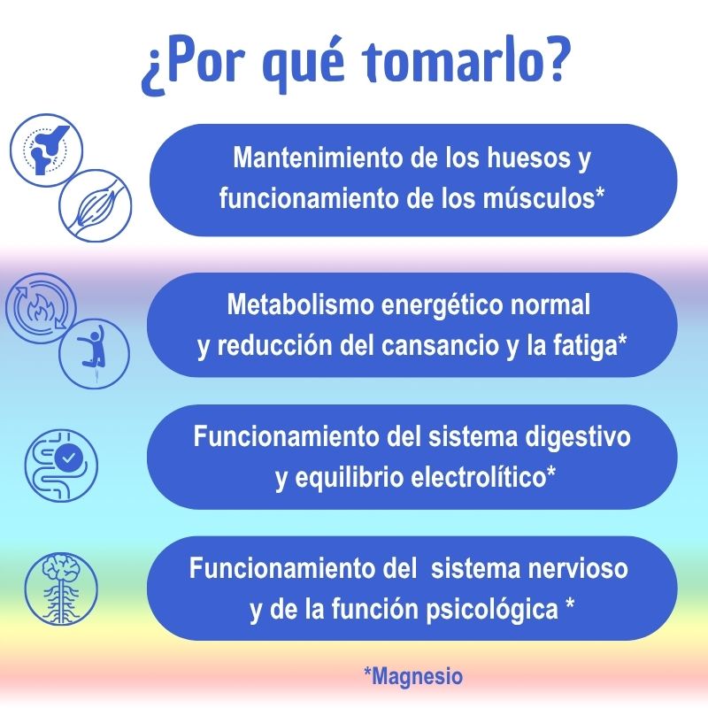 Masmagnesio es un complemento alimenticio que combina tres formas de magnesio: Citrato, Bisglicinato y Malato.