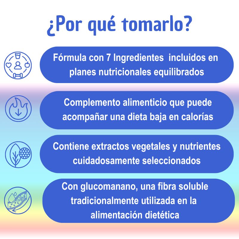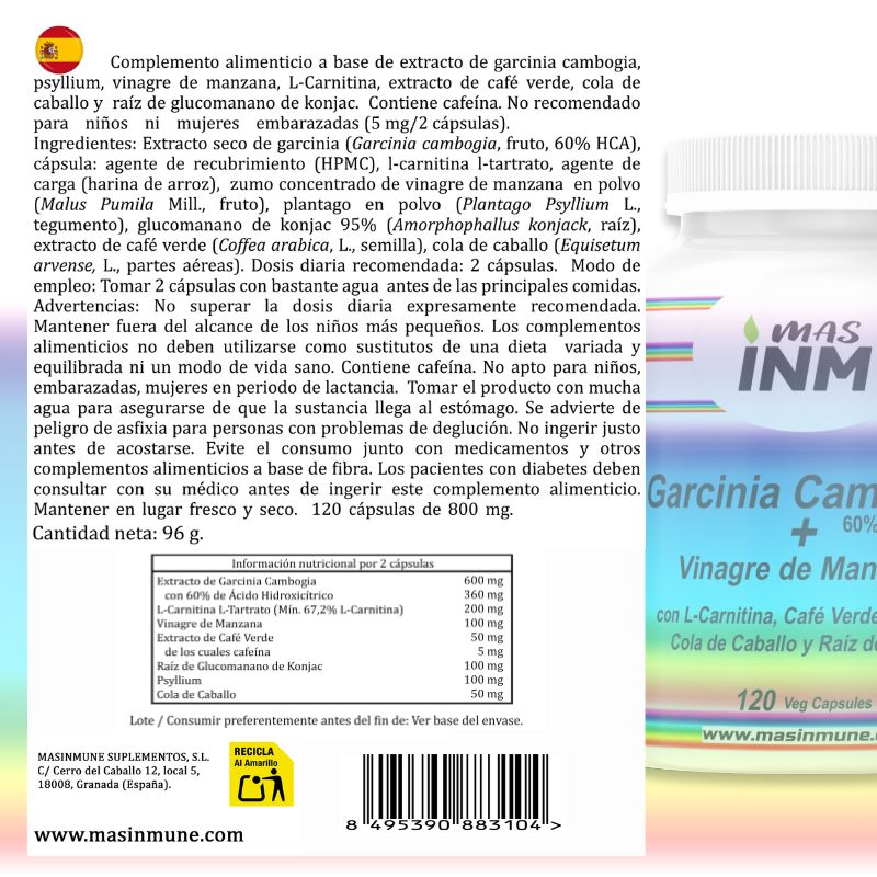Fórmula Masinm compuesta por Extracto de Garcinia Cambogia + L-Carnitina + Vinagre de Manzana + Extracto de Café Verde + Glucomanano de Konjac con Pyllium y Cola de Caballo.