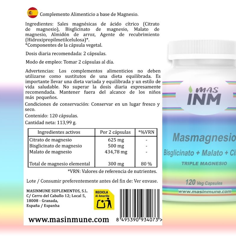 Fórmula Masinm de Triple Magnesio: Citrato + Bisglicinato + Malato.