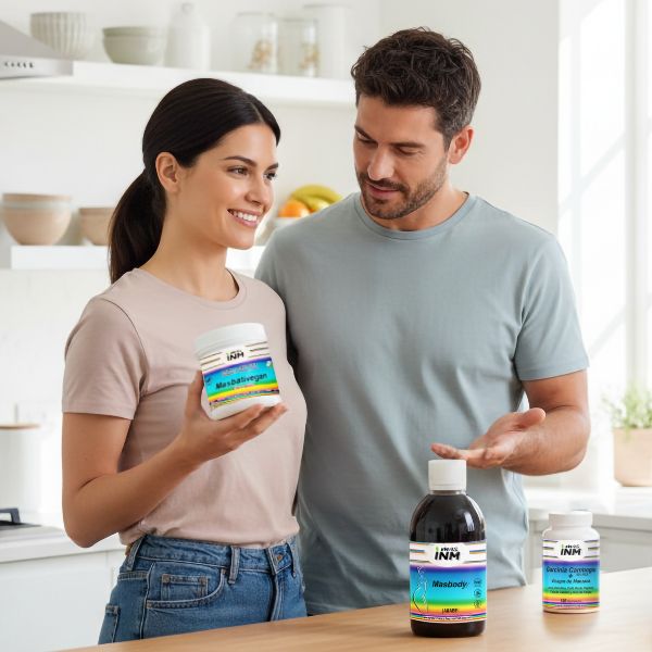 Masbody es un complemento alimenticio en formato líquido formulado a base de extractos vegetales, aminoácidos y vitaminas. La fórmula combina ingredientes de origen vegetal con vitaminas del grupo B y otros nutrientes seleccionados.